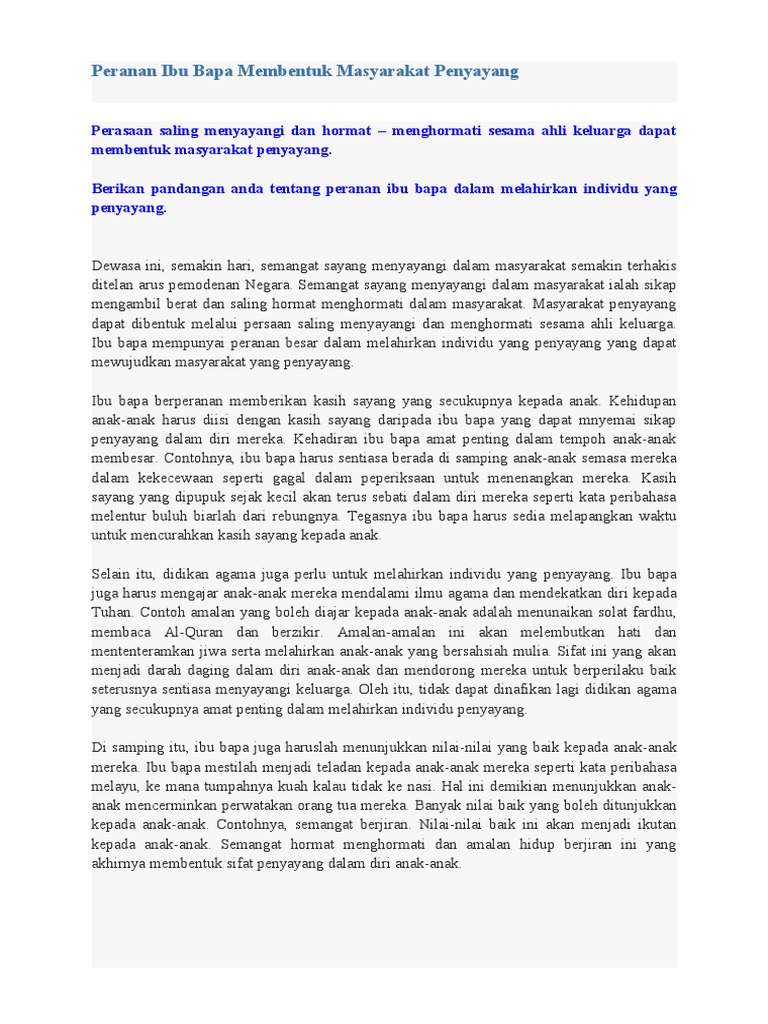 Kebanyakan masyarakat dewasa ini kurang menunjukkan sikap saling menyayangi antara satu sama lain berbanding dengan masyarakat zaman silam. Ibu bapa memainkan peranan yang penting untuk. Jelaskan peranan ibu bapa dalam membentuk masyarakat penyayang.
